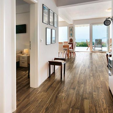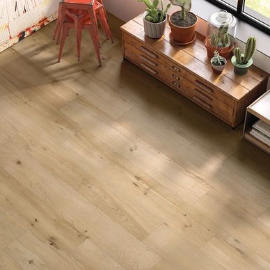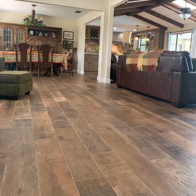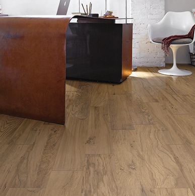 Rustic porcelain wood look tile flooring. Texture is akin to hand-scraped wood. Made in U.S.A.