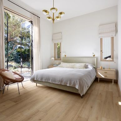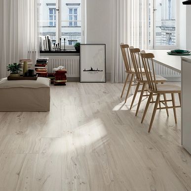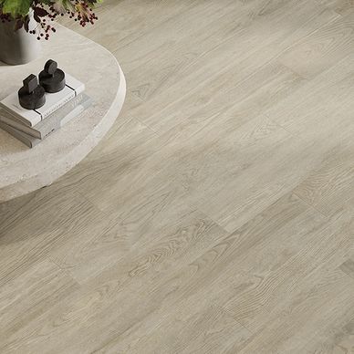 A light coastal wood look porcelain tile series, shown here in White Oak.