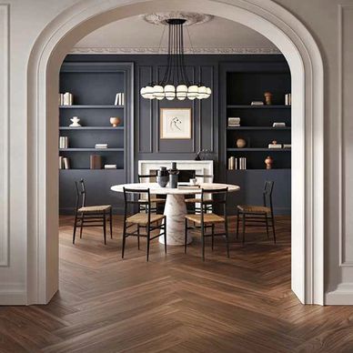 Wood look tile in herringbone pattern; textured graining mimics Italian walnut.